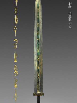 少虡剑是春秋晋国兵器。剑身较长,出刃锋利,出土时几乎没有锈蚀痕迹,剑锋略有残断,整体光亮如新。剑格处有嵌绿松石的兽面纹,剑首有错金云纹。剑脊处有20字铭文,铭文中提到的少虡二字是此剑的名称来源。虡,是一种龙身鹿首的神兽,剑主人应是希望自己像初生的虡一样,能够无所畏惧、勇猛向前。现藏于北京故宫博物院。