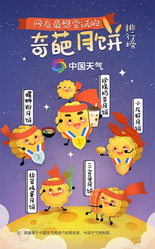 在中国天气网发起的精彩月饼调查中,泡泡茶月饼获得第一名。虽然是新颖的馅料,但口感还是传统的甜糯,可以被网友接受;第二个螺蛳粉月饼,这两年异军突起。大家都很好奇面粉、甜味、臭味融合在一起是什么感觉;还有小龙虾和三文鱼芥末月饼,喜欢水产品的朋友可能愿意试试;至于韭菜蛋月饼,很多网友表示不会尝试。