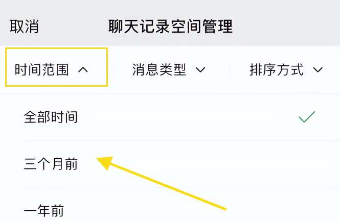 5、最后,在聊天记录空间管理页面,点击时间范围,选择时间即可。
