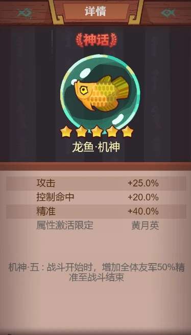 龙鱼机神是黄月英的专属鱼灵,这个神话武器能够为其提升一定的攻击以及控制命中率,在精准度上则是有着大幅度增益。当黄月英带上后还可以出发机身五的被动,战斗开始时为所有友方咸将增加精准值,持续时间是可以一直到战斗结束。