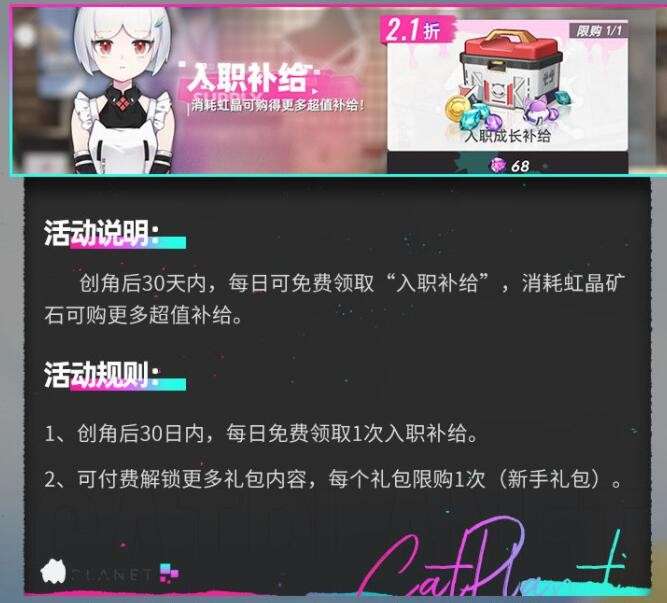 创角后30天内,每日可免费领取“ 入职补给”,消耗虹晶矿石可购更多超值补给。