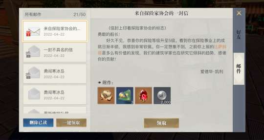 除了解锁发现物获取研究资料外,玩家在使用研究资料提升探险等级后,也可以获取一系列丰富的奖励。需要注意的是,升级了探险等级后,不会直接获得探险声望函,而是会收到一份邮件,在邮件中可以领取探险声望函、爵位证书(洗炼爵位属性)以及星辰秘宝(用于灌注秘宝)。