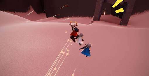 首先来到霞谷的初始位置,利用三人双背的技巧上天,弹射到天上之后我们继续向上非一定的高度,然后往对面的城堡处飞,大概需要飞两分钟。如果我们有队友陪同前往的话,前期上升的高度再高一点然后直接滑行过来就可以了。目标是两个城堡中间的桥梁,成功降落在这座桥上面之后我们就可以往桥里面的建筑走,走到终点处我们会发现没有路了,其实这里还是可以继续前进的,只不过需要我们用到矮人面具。
