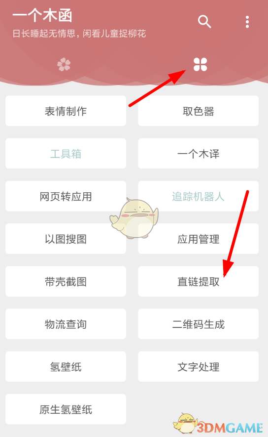 1、打开一个木函,在右侧点击列表按钮,从出现的功能列表里找到“直链提取”的功能。