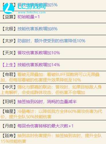 | 【毒心乱舞】 | 【毒心乱舞】密探3/5星升级,消耗能量:4 对敌方全体造成130%/135%/140%攻击力的伤害并进行一次抽签,若抽到吉则永久提升自身5%攻击力, 若抽到凶则对自己造成一次小额伤害。随后为其附加一层【看破】(3回合)【看破】:受到的技能伤害增加15% |