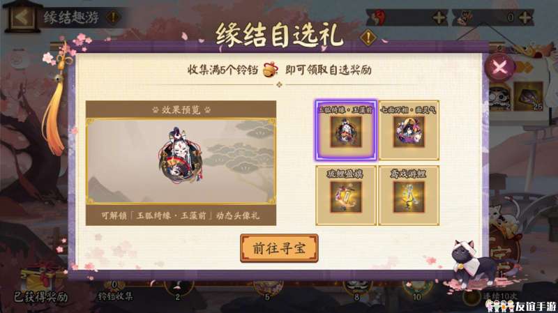 ※猫咪每次寻回宝藏将获得缘结铃、随机SP/SSR式神碎片、御行达摩碎片、大蛇的逆鳞等随机奖励;