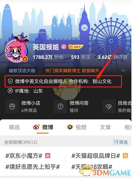 3、进入主页后,在ip属地的上方用户们就能看到博主所属的mcn机构了。