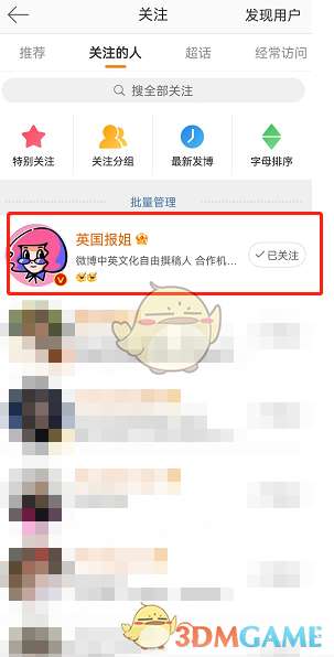 2、在关注列表中找到你想查看的博主,点击进入主页。