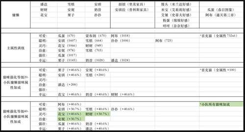 1.下面两个仅统计 给同性格小队猫咪属性的加成效果,给自己属性加成的数据暂未统计,后续可能会补充