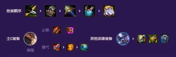 泰隆是阵容主C,火炮+珠光必备,火炮可必备缩角站位,没秒C位而无法补刀;珠光可让技能可暴击,还能增加法强,没有的话也可用无尽,但上限没有珠光高。第三件装备通常是饮血或正义增加续航,如果符文有星界赐福或狩猎律动也可考虑巨杀或破防者(拳套+腰带)。主坦阿利斯塔是所有坦度装备都吃,狂徒最优,释放技能增加的续航大幅度提升。其他坦度装备石像鬼、反甲/龙牙/救赎/圣盾使的誓约都可。