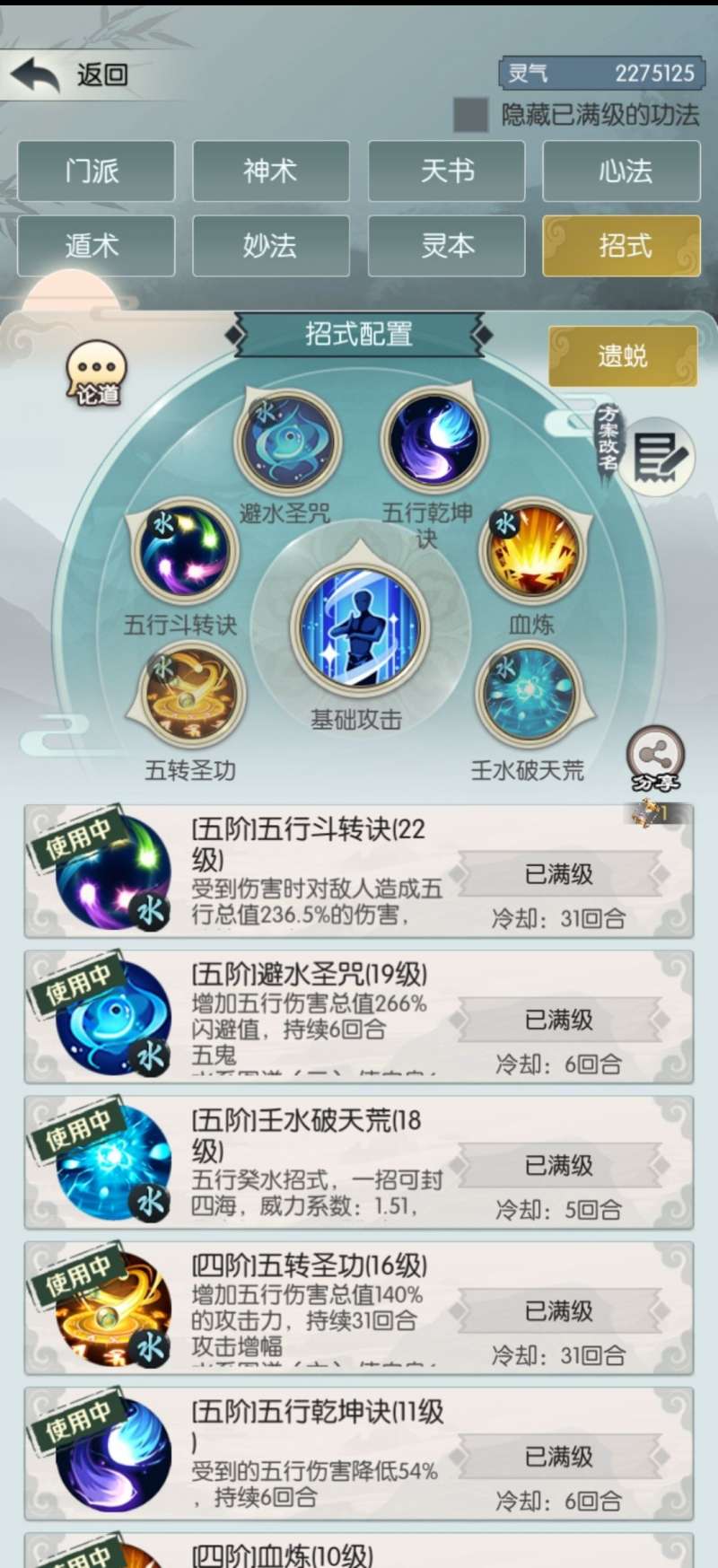 招式选择五转五斗五鬼五乾血炼主五,尽量保证前五个技能都有图谱加成,前两个招式最好是6回合以上保证两次平A打出阴30效果。神通不动剑胎藏锋。