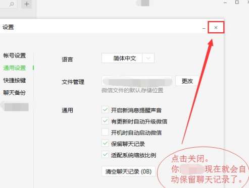 设置好了之后,点击关闭,现在你的微信电脑版就会自动保留聊天记录了。