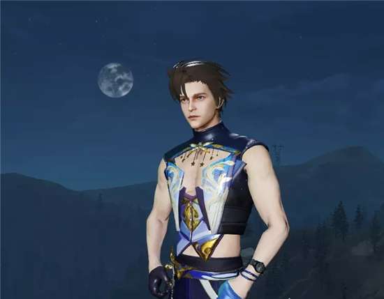男款:蓝白无袖紧身衣,搭配夜空蓝的裤子,加上银月以及凌云图案设计,细节满满。