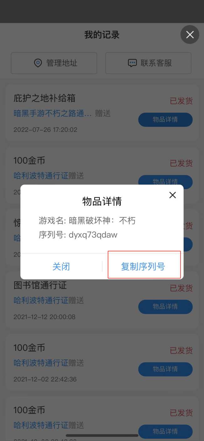 点击左上角:中奖记录—物品详情—复制序列号
