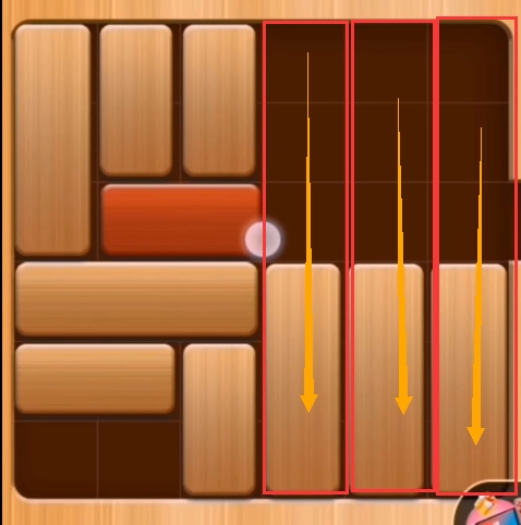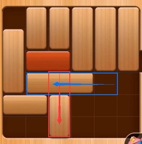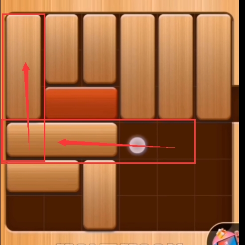 第一步:将第三列的竖立的积木往下推,并把第四排的横向的积木往左边推(如图:)