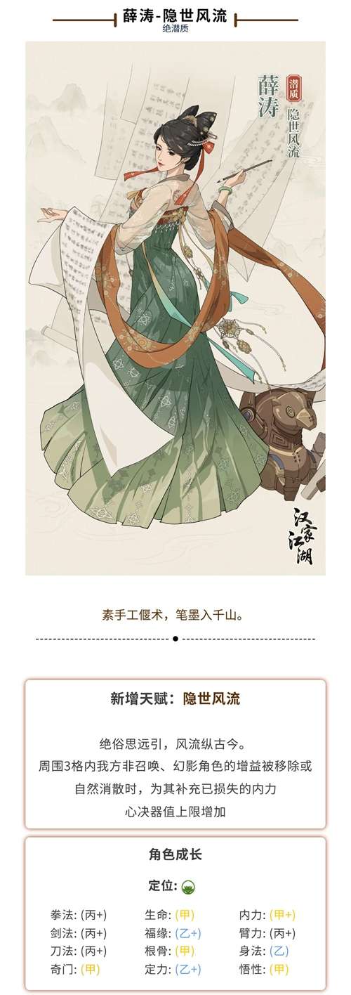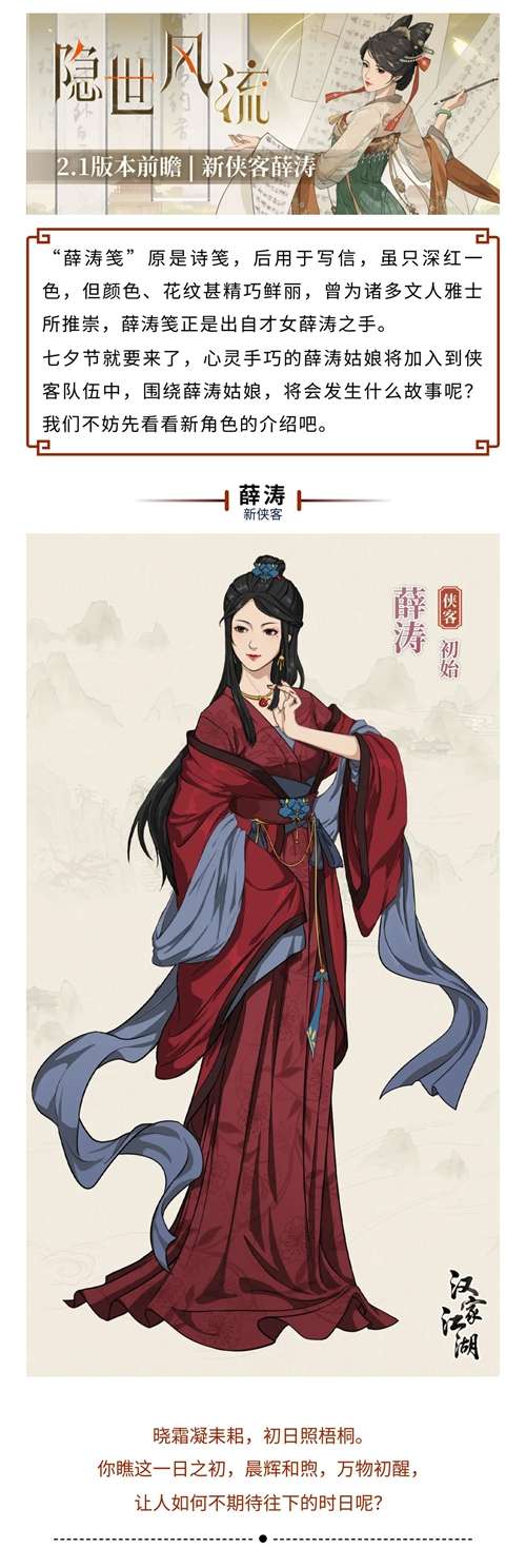 好啦~关于汉家江湖2.1新版本中新侠客薛涛的详细介绍就到此为止啦~更多游戏的活动前瞻内容与游戏攻略教程还请期待更新哟~