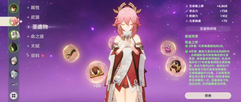 而且八重神子用各种2+2的组合也完全够用,2乐团提供的精通,2角斗提供的攻击或者2雷套提供的雷伤都可以给神子用,玩家可以根据自己圣遗物的储备选择任意2+2组合搭配。