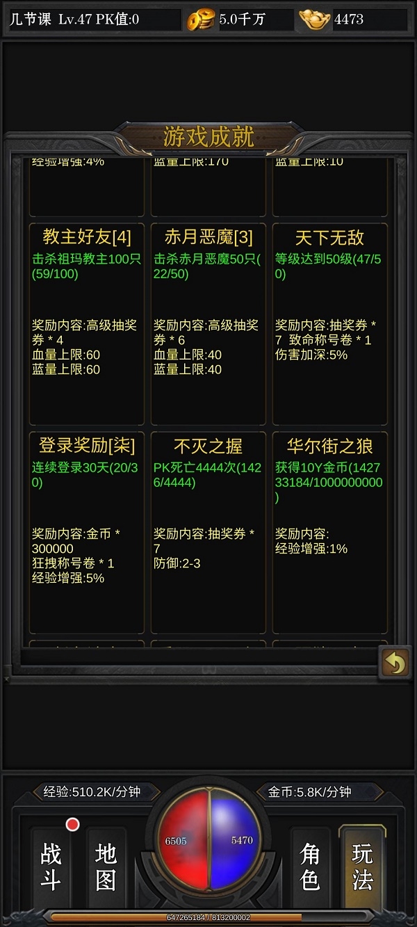 ④40级以后就是搞装备,合装备(祖玛装备三合一,最高+5),挖矿强化属性,做成就,图鉴。想办法把最大防御弄到90以上,再把武器幸运加满,可以挂抉择之地刷祖玛装备了。