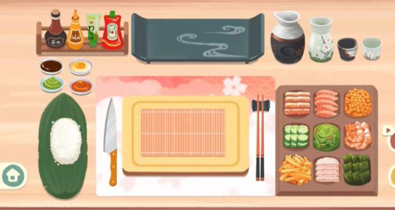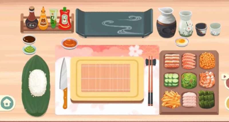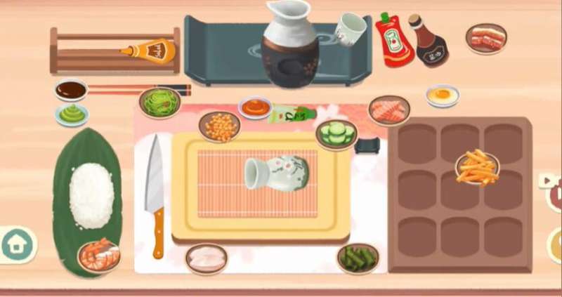 7、最后我们在寿司里加上鱼子酱和海草,酱油和芥末放到盘子上即可过关。