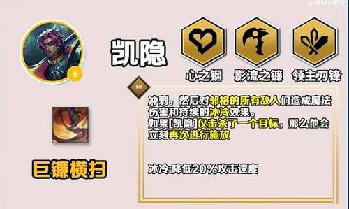 1、凯隐在s10的赛季作为一张5费卡登场,其技能有着范围AOE伤害,对于前排乃至后排都极具威胁力,且如果一次只命中一个敌人,那么这个技能就会立刻进入冷却。