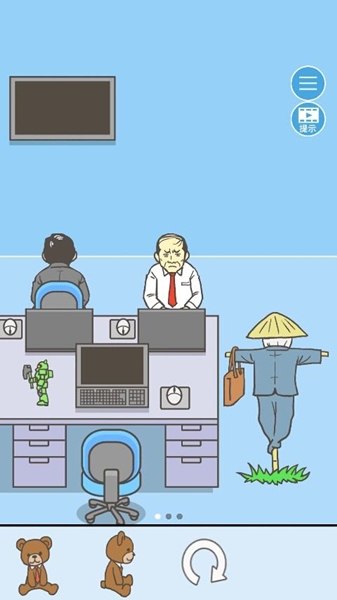 用场景2的柜子里的锤子砸开场景1的裂缝,收集场景1中目前所有的晴天娃娃(两个),挂在场景3的架子上,两个晴天娃娃都各点一下,场景1的窗外就会下雨并出现第三个晴天娃娃,收集起来,同样挂上架子点一下,此时场景1的窗外会下暴雨,暴雨会把老板的假发吹到地上,捡起出口钥匙,打开出口,通关