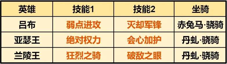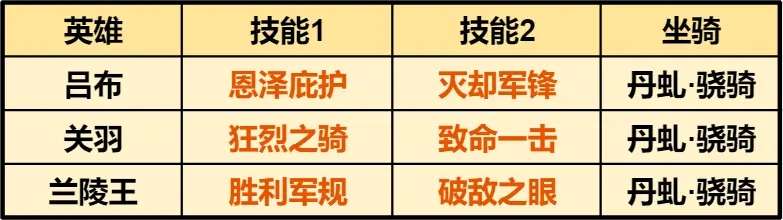 英雄阶级点数与无双骑相同,均为吕布和兰陵王一阶、关羽五阶。