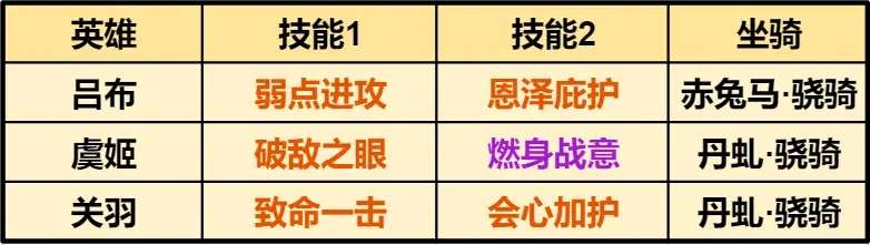 根据吕布的技能特性、战斗风格和兵种专精,我们可以优先考虑同风格专精、连击相关、暴击相关的英雄与其搭配,由此得出下列阵容思路: