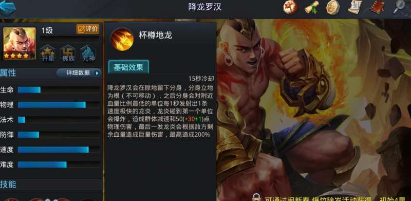 降龙罗汉是输出较高的战士类英雄,优势点在于先手能力比较强,可为自己提供较多的增益性加成状态。在排位、修罗塔、篝火战争等对战中都表现不错,适合走上路的位置。他属于佛族,对魔族英雄具有种族优势,可提高本身百分之六的伤害。