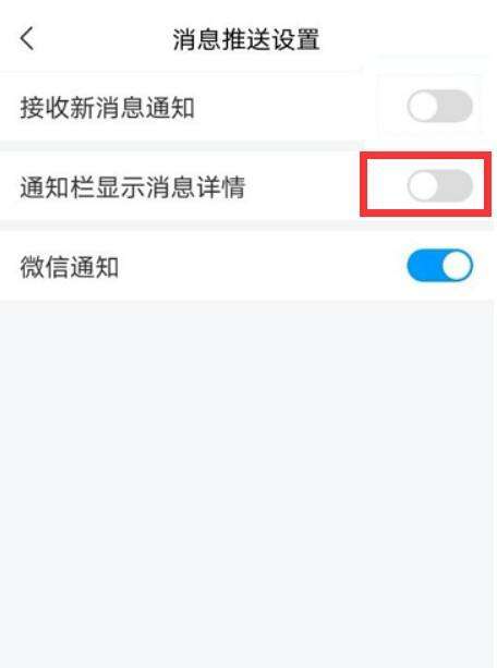 第三步:在【消息推送设置】页面点击【通知栏显示消息详情】后面的按钮开启就OK了。