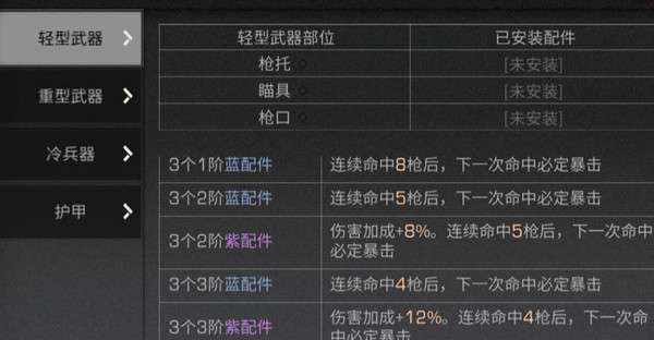 配件方面的话我们还是选择散布降低的比较好,所以玩家可以重点升级瞄具等级,这样才能尽可能的去减少散步的偏差率,也可以配置三级或者以下的配件的专属词条,获得必定暴击的属性;