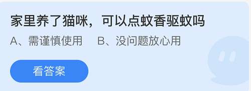 家里养了猫咪,可以点蚊香驱蚊吗?这是支付宝蚂蚁庄园小课堂2022年7月21日题目,答对后能领取小鸡饲料180克,错误只能得到30克!那么为了获得更多的小鸡饲料,我们要保证正确哦!下面小编就给大家带来了支付宝蚂蚁庄园今日答题7月21日答案2022,还不清楚答案的朋友不妨随小编一起看看吧。