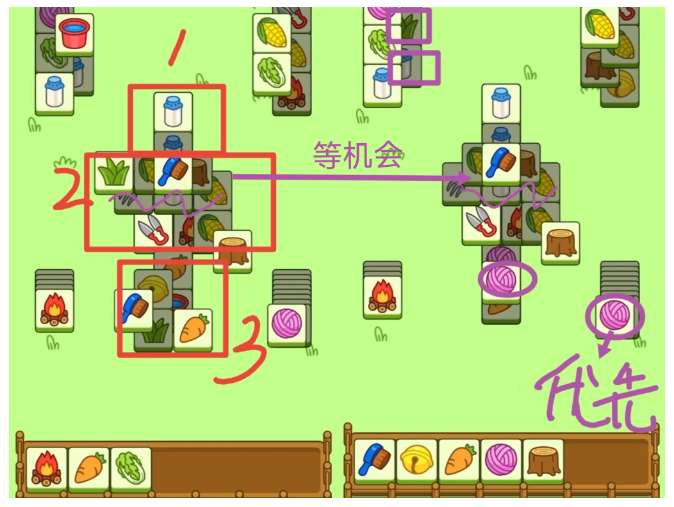 注:卡槽内可以利用急救牌留后路;主攻区牌很顺,重复率很高(一直开一区即可);消除前期,卡槽内卡槽内一旦超过两张余牌,取牌时要算一算。