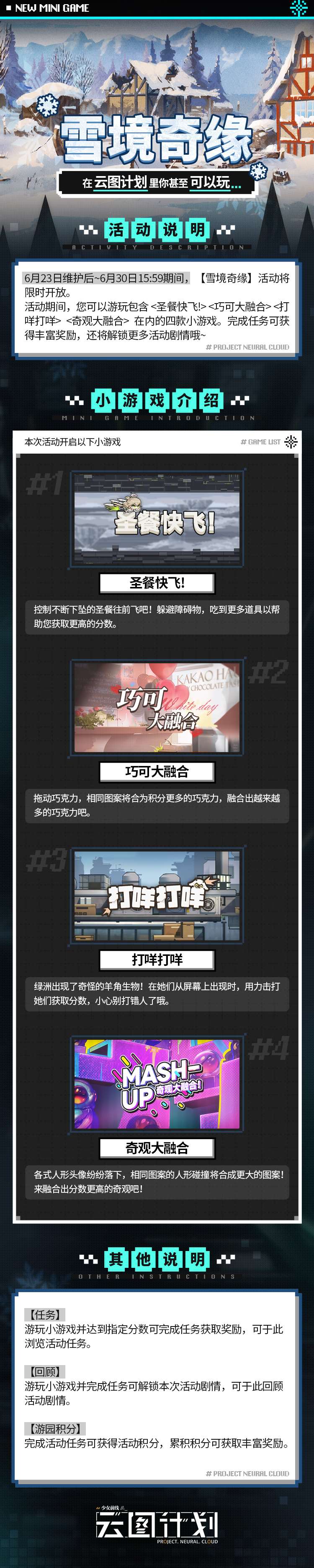 6月23日维护后~6月30日15:59期间,包含<圣餐快飞!><巧可大融合><打咩打咩><奇观大融合>在内的四款小游戏将限时开放。