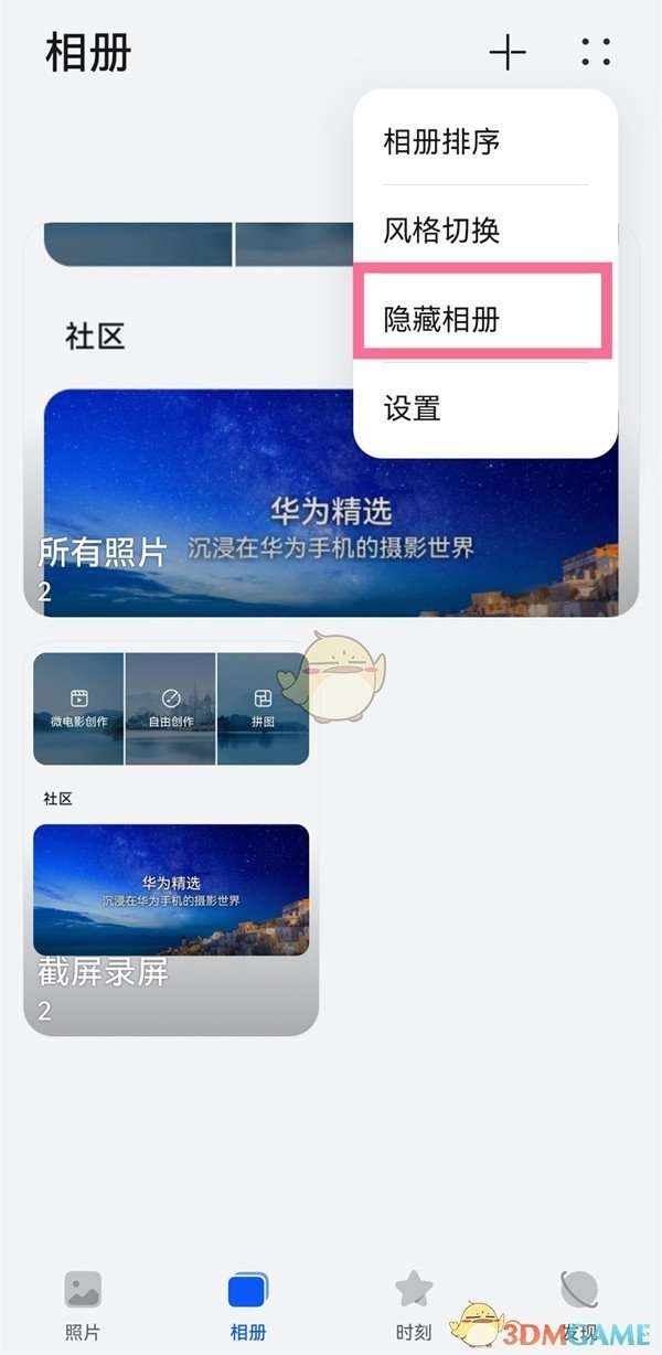 1、首先点击图库右上角四个点,选择【隐藏相册】。