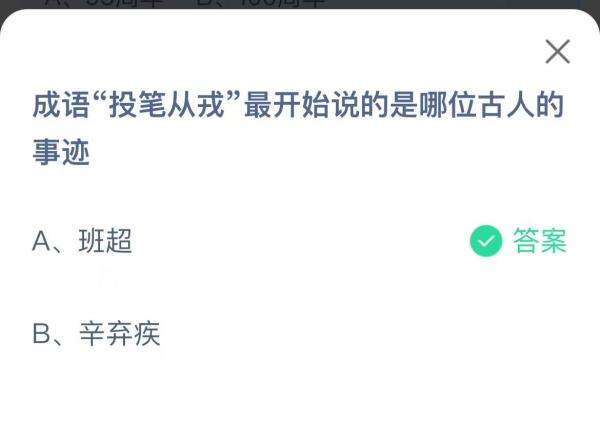 2022支付宝蚂蚁庄园7月31日的题目为:成语投笔从戎最开始说的是哪位古人的事迹?班超还是辛弃疾?很多小伙伴可能还不太清楚正确答案是什么。下面小编就为大家带来了正确答案分享,感兴趣的小伙伴们快一起来看看吧!