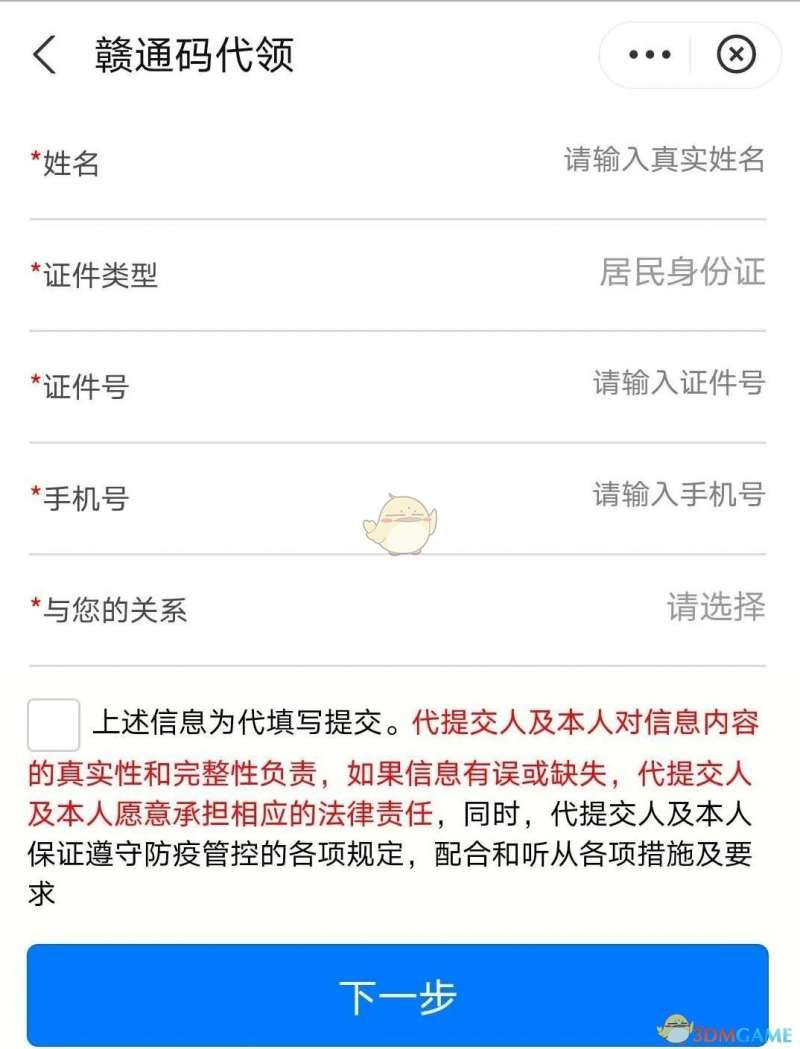3、输入代领对象的姓名、证件号码、手机号、与您的关系等信息,勾选上述信息为代填写提交,点击下一步