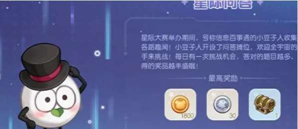 2、活动介绍:星际大赛举办期间,号称信息百事通的小豆子人收集了各路趣闻!小豆子人开设了问答摊位,欢迎全宇宙的选手来挑战,每日有一次挑战机会,答对题目越多,获得的奖品越丰盛