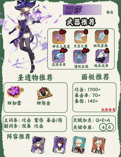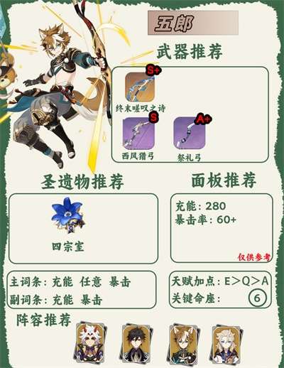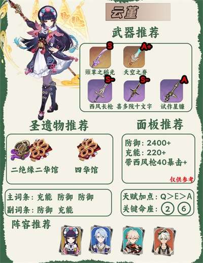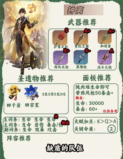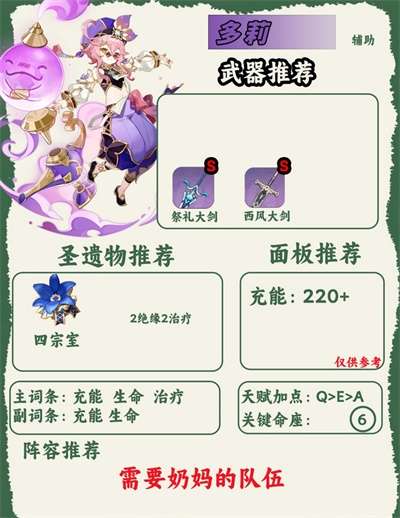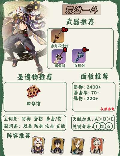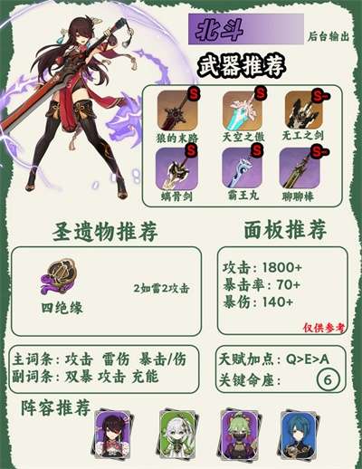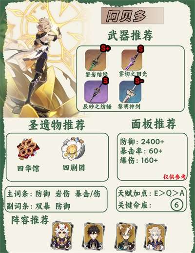 1、主C:指用于站场输出的角色(当然也有极少数速切主C),是队伍打出伤害的主要来源。此类角色大多除了要升级战技天赋E或元素爆发天赋Q外,也要升级普攻天赋A用于站场输出(但也有例外),其普攻天赋A倍率一般不低。