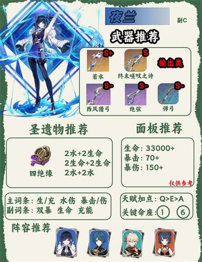 夜兰是一位极速爆发且灵活的五星角色,命座价值巨大无比过于超模导致新角色避之不及,如果你拥有一只满命夜兰,那么从此你的深渊无忧大世界随便玩,因为满命夜兰绝对是提瓦特最值得抽的角色任何队伍带上她都可以速通深渊。