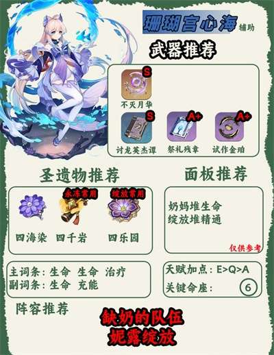 其0命的作用不大,2命起步游戏体验才比较好,6命才是真正意义上的神,荒芒一体,不仅仅有着非常夸张的数值伤害还可以作为全体奶,直接解放队伍中的生存位。