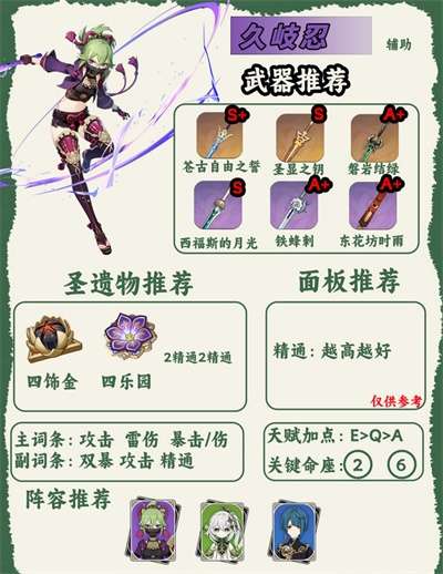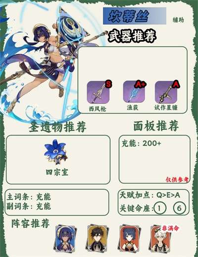 2、副C:指一般以速切爆发手法输出为主的角色,主要任务是打伤害或配合主C创造元素环境,打元素反应。一般不站场输出,发动战技E或元素爆发Q后直接切到后台,等待技能CD。所以一般无需升级普攻天赋A。此类角色的功用有三类: