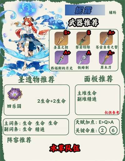 目前原神最强主C,出道即是巅峰,一命增加抗打断可以硬抗若陀龙王的踩踏,二命增加伤害,三命普攻提升三级,那维莱特的普攻倍率还是很好的提升比较大,四命提升伤害、五命大招等级提升三级、六命释放重击时可以吸收附近的源水之滴并将延迟重击1秒,重击命中敌人时每2秒将额外释放两道洪流,伤害相当于那维莱特生命的10%。总的来说那维莱特是目前原神最强主C强度毋庸置疑。