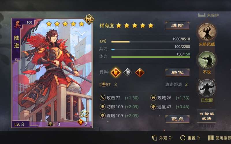 兵种方面刘禅转禁卫学固阵勇毅,推荐天资词条或者其它增加谋略属性的宝物。陆逊转长枪学文韬列阵,吃全兵种增伤,词条首选高熟虑,因为带的胜兵,所以不依赖掩日。