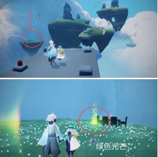 飞到左边的浮岛上去,等几分钟绿色光芒就会掉下来