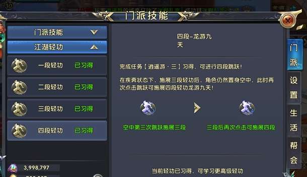 对于初入游戏的玩家来说,应当优先完成所有能够奖励轻功值的任务,这是最直接的提升方式。心法决定了轻功的强度,玩家应当合理分配资源,优先提升能够直接增加轻功值的心法等级。任何能够提升轻功的装备都不应忽视。玩家应当攒集资源对这些装备进行强化和精炼,以获得最大化的轻功值提升效果。