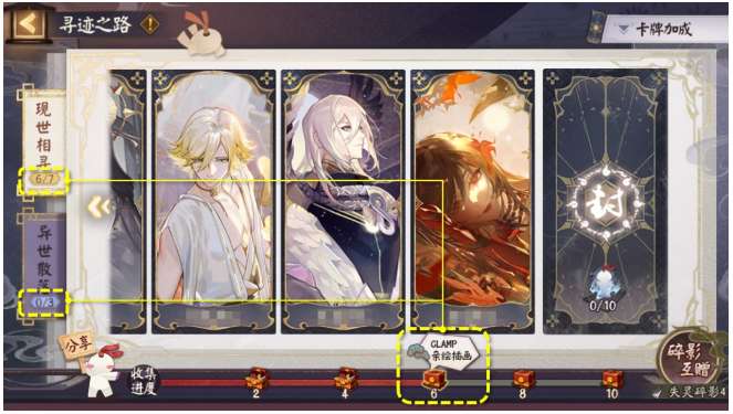 收集6张现世相寻的卡牌即可获得CLAMP亲绘插画,异世散落的3张卡牌只会影响后续2个奖励(1张5星美食结界卡、1个4星蛋)。