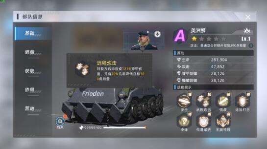 2、帝国Ⅴ号则是队伍中仅有的承伤角色,它的被动技能【掩护友军】和【反击怒火】都能很好的保护己方部队;美洲狮则可以补足一些伤害,主动技能【远程炮击】对地方后排造成AOE穿甲伤害,并带有一定的减能效果。