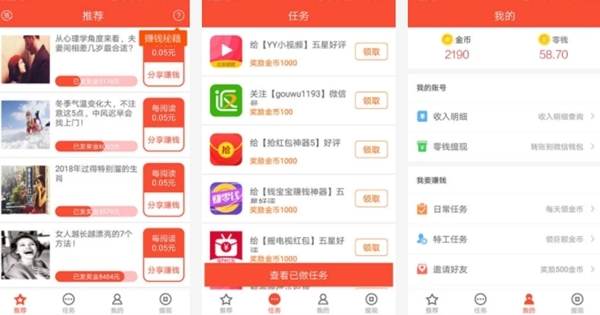 今日赚钱APP的新用户可以获得10元以内不等的现金奖励,只需要在微信朋友圈进行分享,通过好友点击次数来获得现金奖励。每天都有不同类型的任务进行推送。