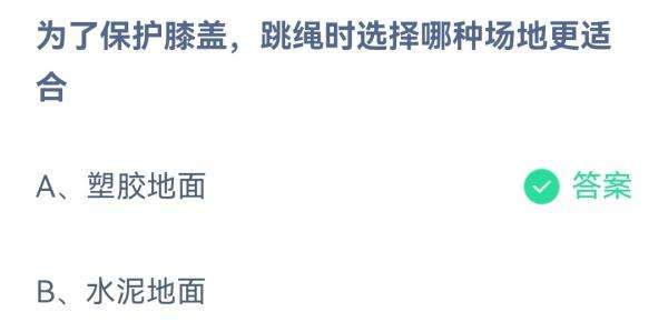2022支付宝蚂蚁庄园7月8日的题目为:为了保护膝盖跳绳时选择哪种场地更适合?正确答案是什么呢?很多小伙伴可能还不太清楚。下面小编就为大家带来了正确答案分享,希望能帮助到你。