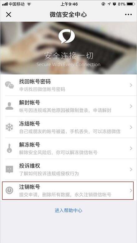 4、在安全中心中,选择【注销帐号】功能,这是结束当前微信账号使用的步骤。